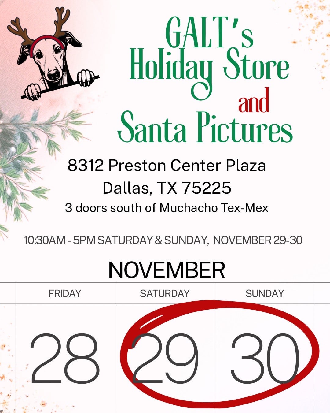Please join us at our annual Holiday Store with Santa pictures on Saturday, November 29 and Sunday, November 30, from 10:30am-5:00pm at 8312 Preston Center Plaza in Dallas. The shopping center is at the south east corner of Preston & NW Hwy and the store is 3 doors down from Muchacho Tex-Mex Restaurant. There will be lots of shopping from our Greytstore including the 2026 GALT and Celebrating Greyhounds calendars, clothing, art, and many fabulous raffle items. We are thrilled to have Santa Vern join us again. Reserve your photo session here. We will do our best to accommodate walk ins. All proceeds go to help the hounds, so you can shop guilt free!