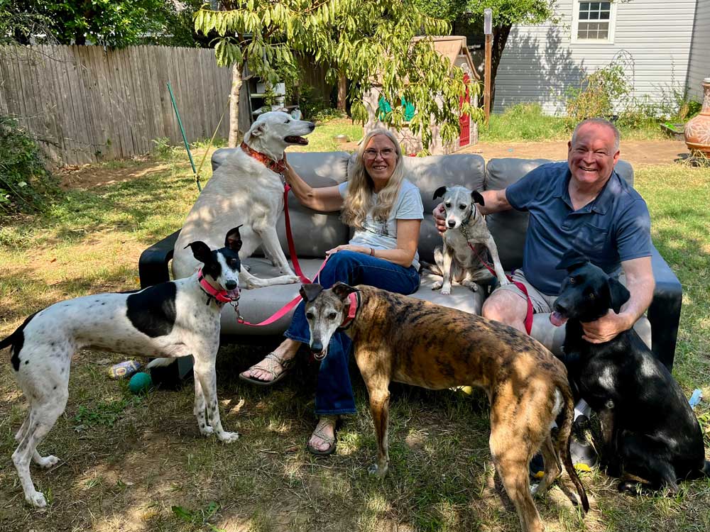 When a dog lover named Pennye read about Jez on the GALT website, she wanted to know more about this 12-year-old “honorary greyhound” who had been rescued by GALT a few weeks ago from a neglect situation in Grapevine. Pennye was pleased to hear that Jez’s wonderful foster parents, Steve and Lori Carroll, were planning to adopt Jez in the near future! They told Pennye that Jez gets around great, even though she is half deaf and half blind. After a short adjustment period, Jez has settled in well with her four hound sisters and a few cats. Even at her age, she still runs zoomies in the yard, so the Carrolls have decided to rename her Judy Jetson!