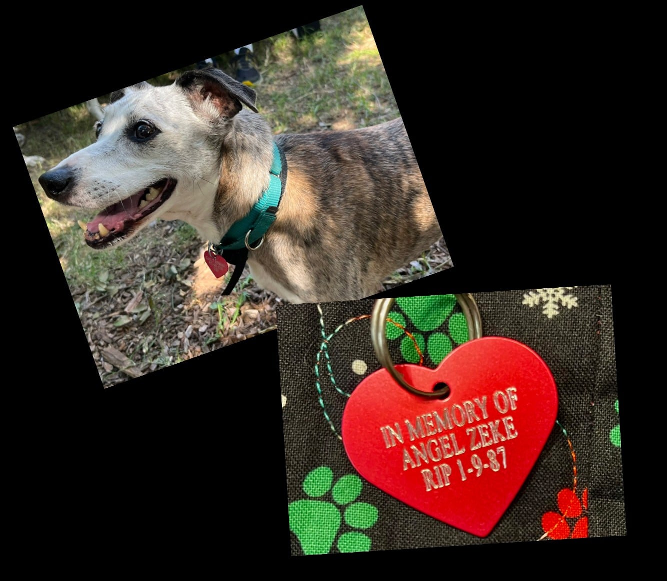 Sandra Lyman was also inspired to join the Blazer’s Guardian Angels program recently. She has sponsored a couple of her former fosters, Dosey and Audrey, in memory of her beloved Adrienne and her Basset puppy Abby. All of the GALT greys in this program get a special GALT tag with the name and Rainbow Bridge date of his or her Blazer’s Angel on the back.