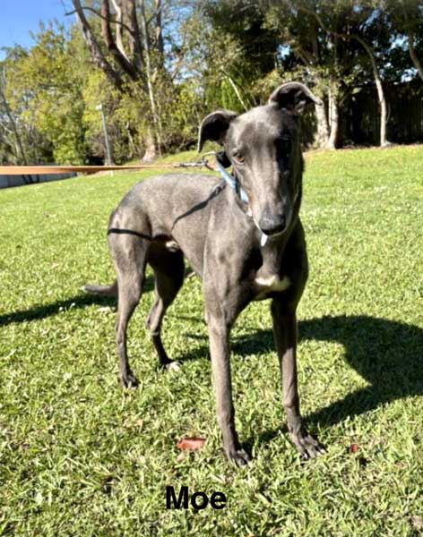 Moe is a happy, calm, and well-balanced greyhound with a sweet and gentle disposition. He approaches new environments with curiosity, exploring at a relaxed and confident pace. Moe enjoys sniffing around and taking in his surroundings without rushing, showing a calm confidence that makes him easy to be around.