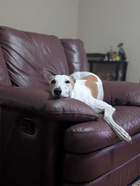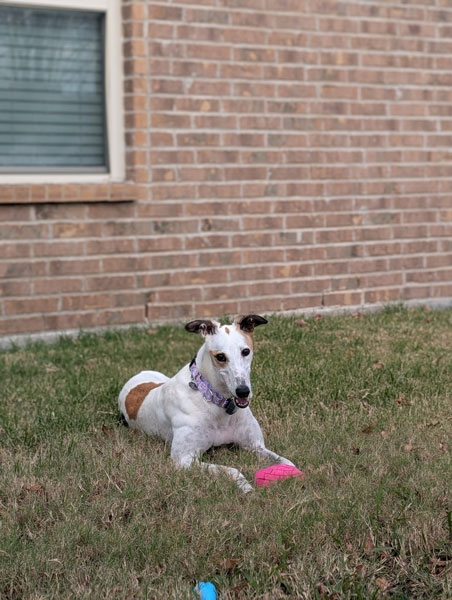 She has been shy yet appropriate with other greyhounds. On walks, she is fearful of unfamiliar dogs. A calm, confident canine companion could work, and she would also do very well as an only dog. Prey drive has been minimal (one brief bird chase, quickly disengaged). Tiara has not been around children. If placed with kids, they should be older, calm, and dog-savvy, especially around food and toys. Important note: Tiara is protective of high-value food items. Hands should never be placed near her food or lick mats while she is engaged.
