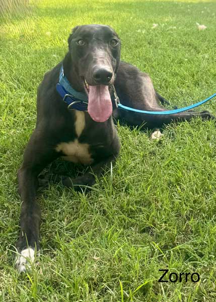 Meet Zorro! This one is not a fictional character, he’s 100% greyhound. He was a bit reserved when he first arrived, as alter-egos frequently are. Don Diego de la Vega (or Zorro as we know him) quickly acclimated to the house and has excellent house manners, always being the perfect gentleman.
